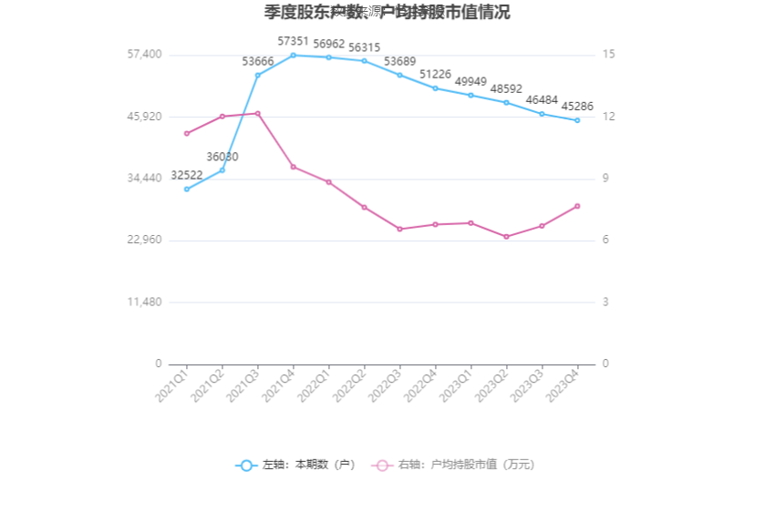 筹码集中度方面,截至2023年年末,公司股东总户数为4.53万户,较三季度末下降了1198户,降幅2.58%;户均持股市值由三季度末的6.72万元上升至7.68万元,增幅为14.29%。