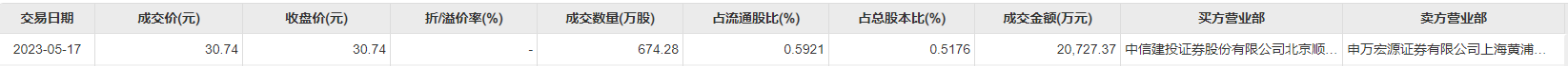 5月17日大宗交易成交674.28万股,成交额2.07亿元,占当日总成交额的33.31%,成交价30.74元,较市场收盘价30.74元持平。