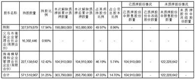 ● 截至本公告披露日,陈刚先生及其一致行动人义乌市衡英企业管理合伙企业(有限合伙)、珠海横琴舜和企业管理合伙企业(有限合伙)(以下简称“控股股东及其一致行动人”)合计持股数量为571,510,967股,占公司总股本的31.25%。本次解除质押后,控股股东及其一致行动人累计质押股份数量为268,790,000股,占控股股东及其一致行动人合计所持股份的47.03%,占公司总股本的14.70%。