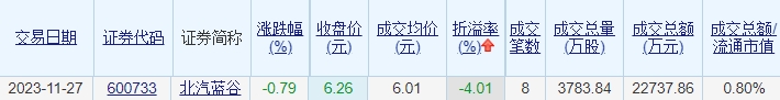 北汽蓝谷昨日大宗交易成交3783.84万股 成交额2.27亿元