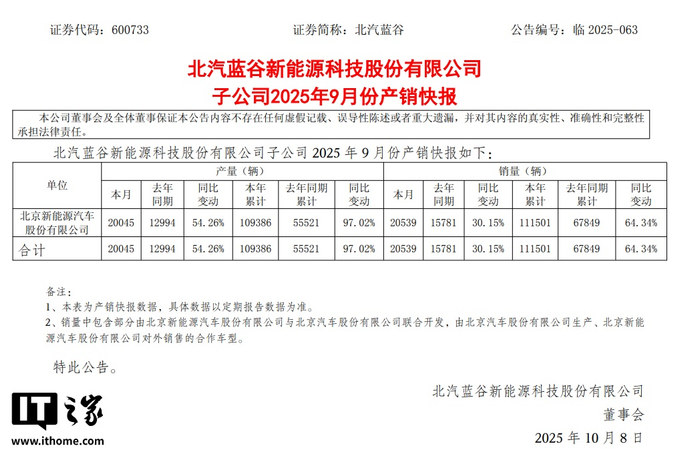 IT之家 10 月 8 日消息,北汽蓝谷今日发布最新的 9 月份产销快报,子公司北京新能源汽车股份有限公司 9 月份销售 20539 辆,同比增长 30.15%;今年累计销售 111501 辆,同比增长 64.34%。