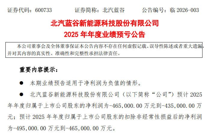1月19日,北汽蓝谷(600733.SH)新能源科技股份有限公司发布2025年年度业绩预亏公告,预计全年归属于上市公司股东的净利润亏损43.5亿至46.5亿元,扣非净利润亏损46.5亿至49.5亿元。