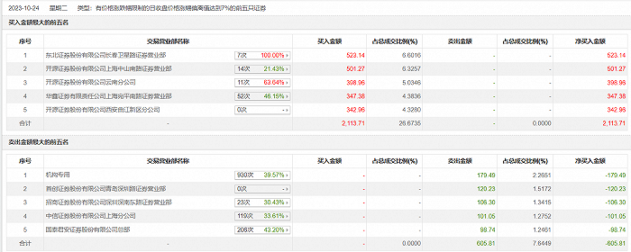 新华锦10月24日涨停,龙虎榜数据显示,上榜营业部席位全天成交2719.53万元,占当日总成交金额比例为34.32%。其中,买入金额为2113.71万元,卖出金额为605.81万元,合计净买入1507.9万元。