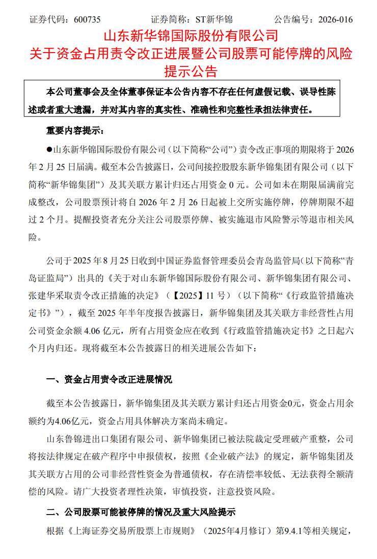 2月10日,ST新华锦(维权)(600735.SH)公告称,公司间接控股股东新华锦集团及其关联方累计归还占用资金0元,资金占用余额约为4.06亿元。若公司未能在六个月内清收被占用资金,股票将被实施停牌,停牌后两个月内仍未完成整改的,将被实施退市风险警示,此后两个月内仍未完成整改的,将被终止上市交易。公司股票预计将自2026年2月26日起被上交所实施停牌,停牌期限不超过2个月。