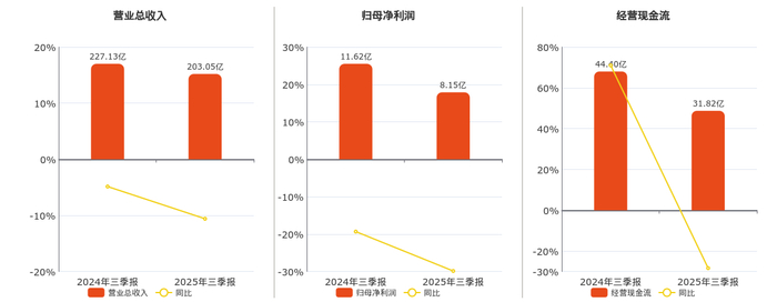 公司营业总收入为203.05亿元,在已披露的同业公司中排名第1,较去年同报告期营业总收入减少24.08亿元,同比较去年同期下降10.60%。归母净利润为8.15亿元,在已披露的同业公司中排名第1,较去年同报告期归母净利润减少3.47亿元,同比较去年同期下降29.86%。经营活动现金净流入为31.82亿元,在已披露的同业公司中排名第1,较去年同报告期经营活动现金净流入减少12.58亿元,同比较去年同期下降28.33%。