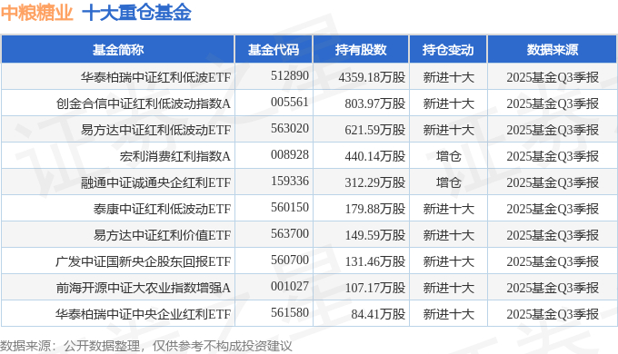 持有中粮糖业最多的基金为华泰柏瑞中证红利低波ETF,目前规模为201.64亿元,最新净值1.187(10月29日),较上一交易日下跌0.84%,近一年上涨9.83%。该基金现任基金经理为柳军。