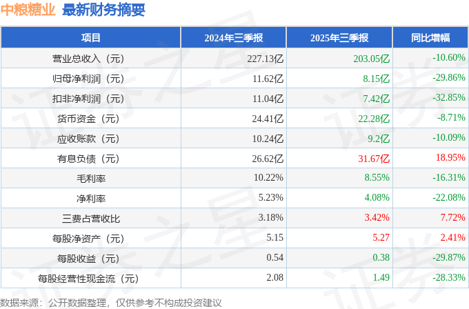据证券之星公开数据整理,近期中粮糖业(600737)发布2025年三季报。根据财报显示,中粮糖业净利润同比下降29.86%。截至本报告期末,公司营业总收入203.05亿元,同比下降10.6%,归母净利润8.15亿元,同比下降29.86%。按单季度数据看,第三季度营业总收入85.37亿元,同比上升10.06%,第三季度归母净利润3.7亿元,同比上升23.57%。