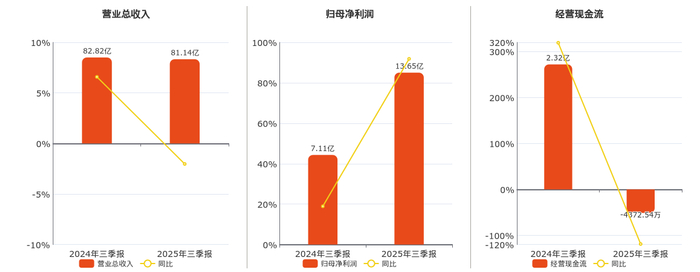 公司营业总收入为81.14亿元,较去年同报告期营业总收入减少1.68亿元,同比较去年同期下降2.03%。归母净利润为13.65亿元。经营活动现金净流入为-4372.54万元,在已披露的同业公司中排名第46,较去年同报告期经营活动现金净流入减少2.76亿元,同比较去年同期下降118.82%。
