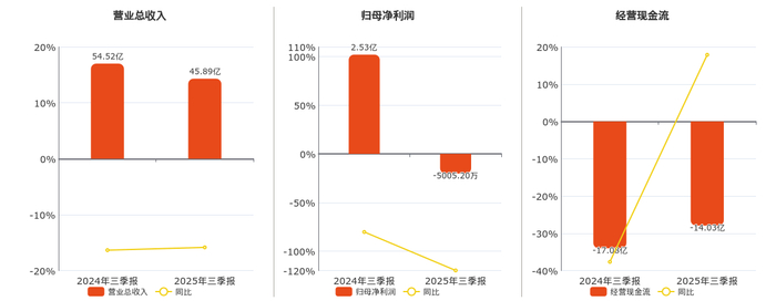 公司营业总收入为45.89亿元,较去年同报告期营业总收入减少8.63亿元,同比较去年同期下降15.84%。归母净利润为-5005.20万元,较去年同报告期归母净利润减少3.03亿元,同比较去年同期下降119.81%。经营活动现金净流入为-14.03亿元,较去年同报告期经营活动现金净流入增加3.05亿元。
