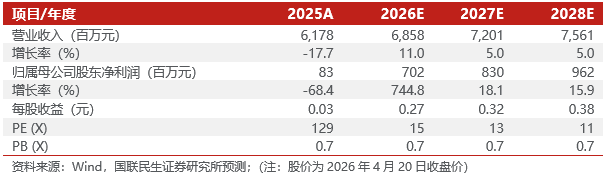 2026年4月20日,公司发布2025年年报及2026年一季报,1)2025年营业收入61.78亿元,同比下降17.70%。归母净利润8313.46万元,同比下降68.40%。2)公司2026年一季度实现营业收入14.63亿元,同比下降13.01%;归母净利润亏损1820.48万元,上年同期亏损7025.91万元。