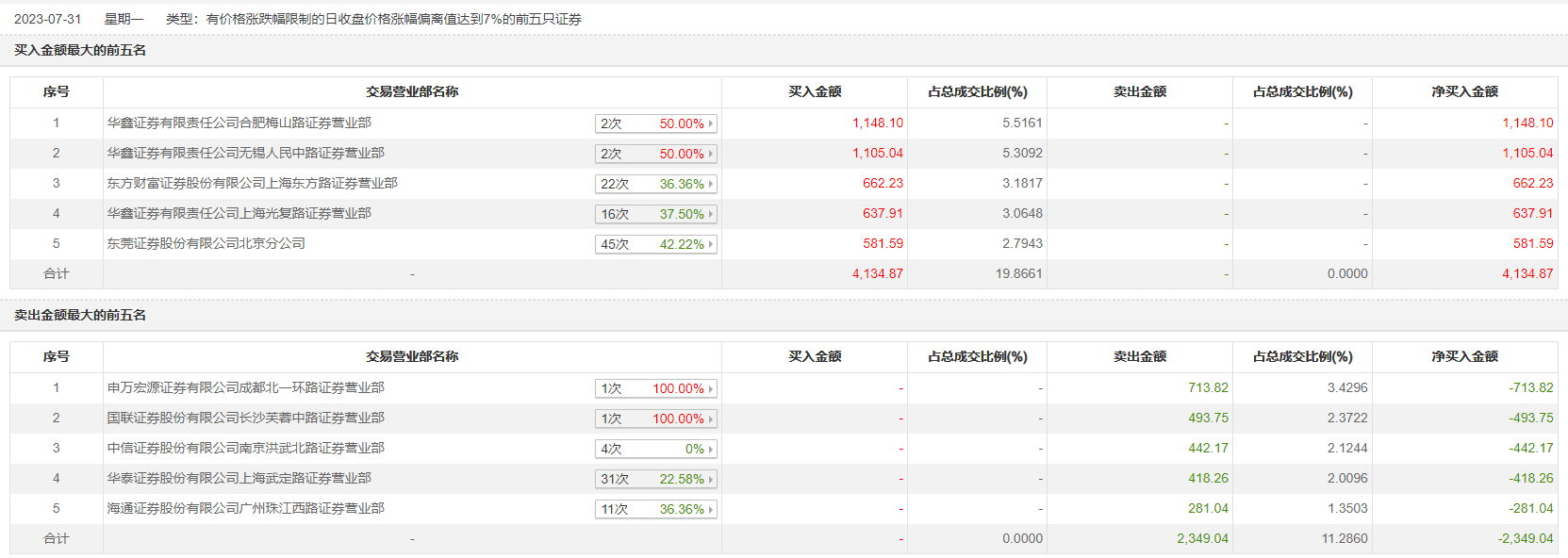7月31日,华远地产今日涨停,龙虎榜数据显示,上榜营业部席位全天成交6483.91万元,占当日总成交金额比例为31.15%。其中,买入金额为4134.87万元,卖出金额为2349.04万元,合计净买入1785.83万元。
