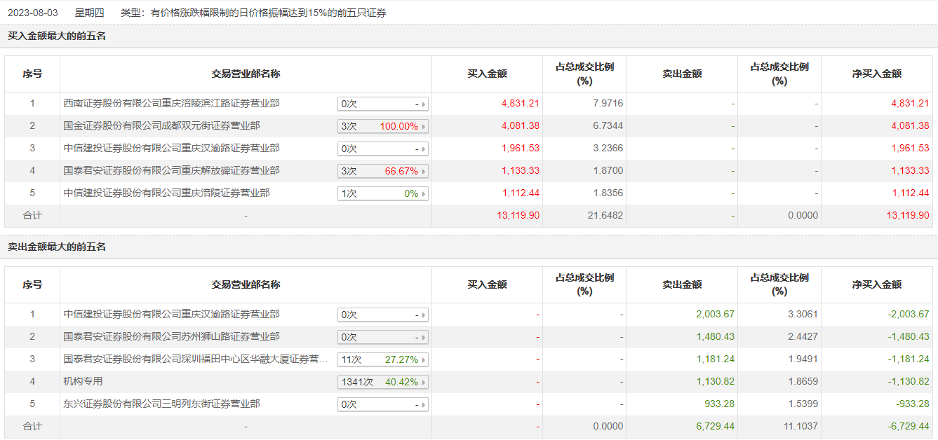 具体来看,机构合计净卖出1130.82万元。此外,西南证券重庆涪陵滨江路证券营业部、国金证券成都双元街证券营业部分别买入4831.21万元、4081.38万元;中信建投证券重庆汉渝路证券营业部、国泰君安证券苏州狮山路证券营业部分别卖出2003.67万元、1480.43万元。