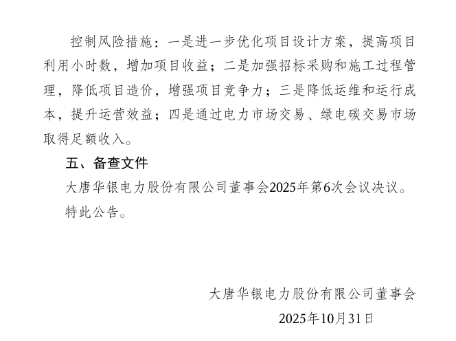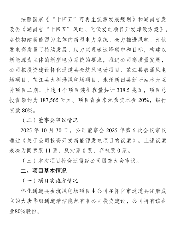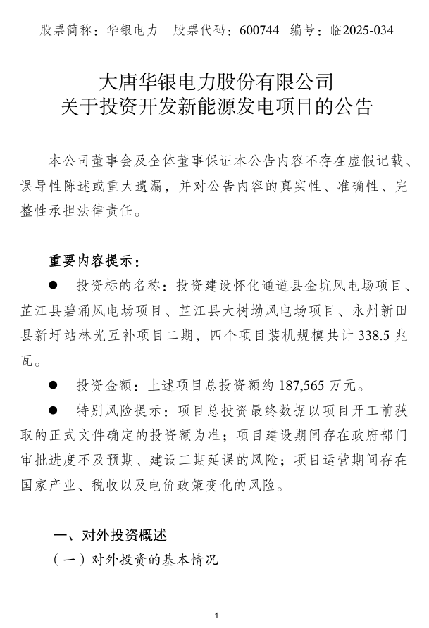 风芒能源获悉,10月31日,大唐华银电力股份有限公司(以下简称“华银电力”)发布《关于投资开发新能源发电项目的公告》。