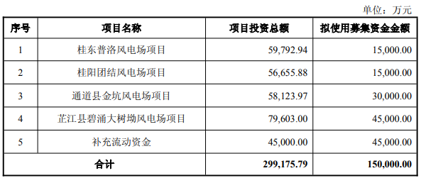 公告显示,华银电力本次向特定对象发行募集资金总额预计不超过150,000.00万元(含本数),在扣除发行费用后将全部用于以下项目:桂东普洛风电场项目、桂阳团结风电场项目、通道县金坑风电场项目、芷江县碧涌大树坳风电场项目、补充流动资金。
