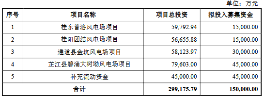 1月29日,华银电力披露的《向特定对象发行股票证券募集说明书(申报稿)》显示,公司本次向特定投资者发行A股股票募集资金总额不超过150,000万元(含本数),在扣除发行费用后将用于桂东普洛风电场项目、桂阳团结风电场项目、通道县金坑风电场项目、芷江县碧涌大树坳风电场项目、补充流动资金。