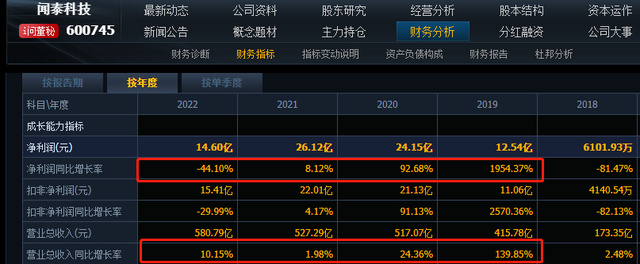 2022 年,闻泰科技实现营业收入为580.79亿元,同比增长10.15%;净利润为 14.60 亿元,同比下降 44.10%;扣非净利润为15.41亿元,同比下降29.99%。
