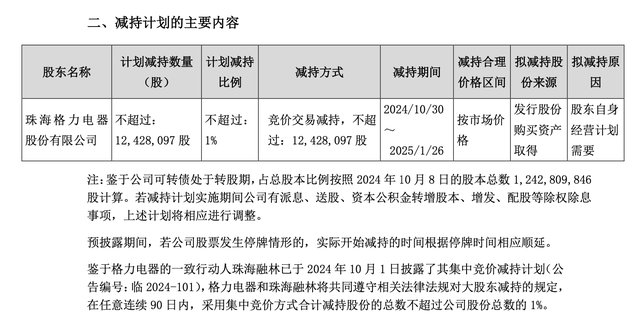 公告指出,鉴于格力电器的一致行动人珠海融林已于2024年9月30日披露了其集中竞价减持计划,格力电器和珠海融林将共同遵守相关法律法规对大股东减持的规定,在任意连续90日内,采用集中竞价方式合计减持股份的总数不超过公司股份总数的1%。据当时股东减持股份计划公告显示,珠海融林计划通过集中竞价交易方式减持公司股份数量不超过1242.8097万股(不超过公司截至2024年9月27日公司总股本的1%),将于本减持计划公告之日起15个交易日后的3个月内进行,减持价格视市场情况确定。