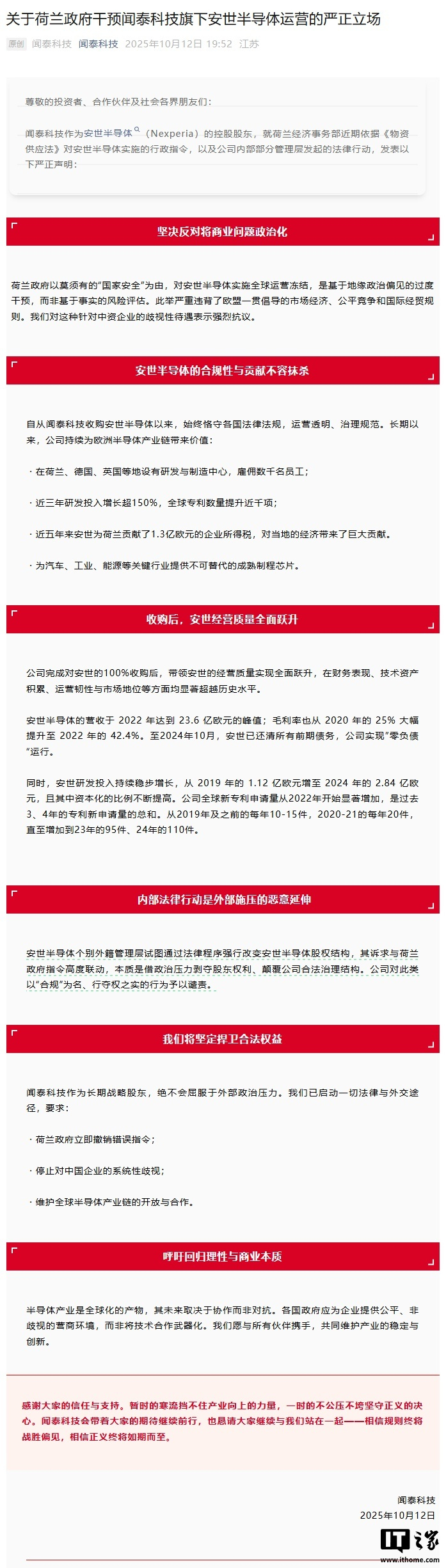闻泰科技 10 月 12 日晚发表声明,谴责荷兰政府以“国家安全”为由冻结安世半导体全球运营,称此举违背市场经济原则。安世半导体个别外籍管理层试图通过法律程序改变股权结构,闻泰科技认为这是借政治压力剥夺股东权利。公司表示将捍卫合法权益,呼吁回归商业本质。