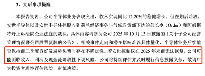 据其指出,若安世控制权在2025年末前无法恢复,公司可能面临收入、利润及现金流阶段性下调风险。