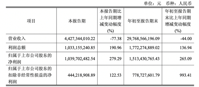 今年前三季度,公司实现营收为297.69亿元,同比减少44%;归母净利润为15.13亿元,同比增长265.09%。