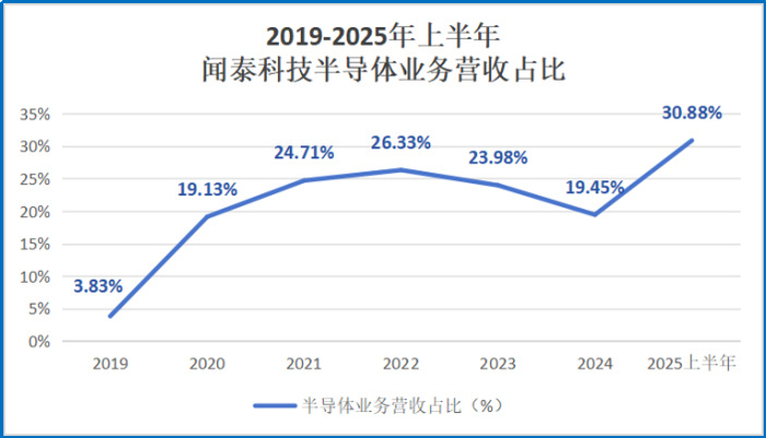 如今,闻泰科技的半导体业务营收在公司总营收中占比持续攀升。从2019年刚纳入时的3.83%,已经壮大到了2025年上半年的30.88%。