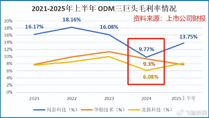 2024年,闻泰科技、华勤技术、龙旗科技“三巨头”的整体毛利率均降到了10%以下,甚至从下滑幅度来看,闻泰科技、龙旗科技受影响更大。