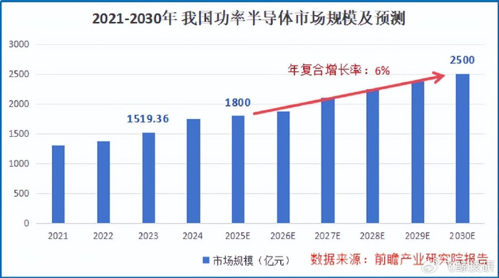 据估计,2023年我国功率半导体市场规模大约1500亿元,2025年将超过1800亿元,2030年更是预计能接近2500亿元,2025-2030年的年复合增速约为6%。
