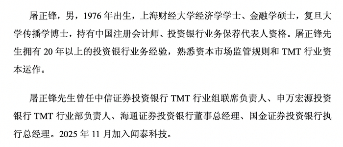 屠正锋曾任中信证券投资银行TMT行业组联席负责人、申万宏源投资银行TMT行业部负责人、海通证券投资银行董事总经理、国金证券投资银行执行总经理。2025年11月加入闻泰科技。