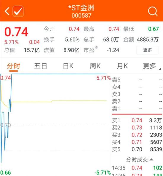 *ST金洲今日以涨停开盘,股价迅速被打至跌停,经过一小段时间的上蹿下跳后,股价再次封上涨停,收于0.74元/股。这是*ST金洲连续第10个交易日低于面值。