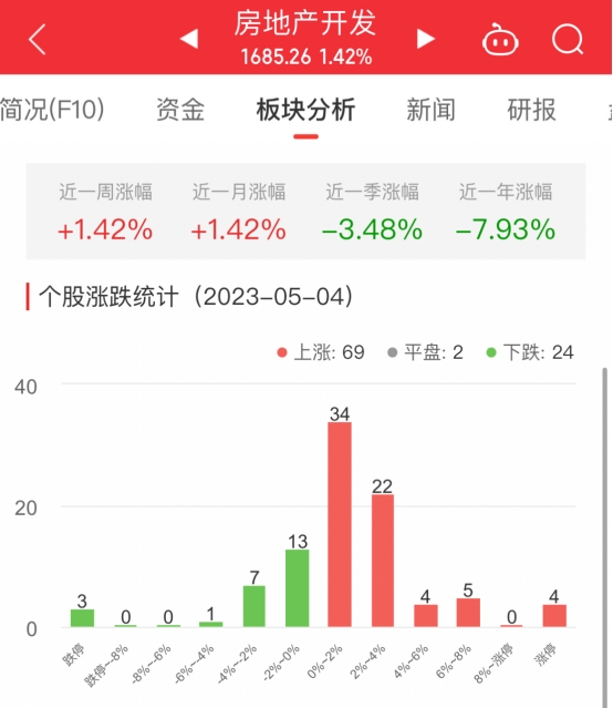 中国经济网北京5月4日讯今日,房地产开发板块整体涨幅1.42%,其中69只股票上涨,2只股票平盘,24只股票下跌。
