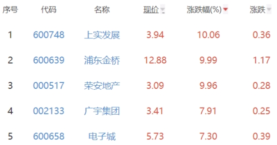 其中,上实发展、浦东金桥、荣安地产、广宇集团、电子城位列板块涨幅榜前五位,涨幅分别为10.06%、9.99%、9.96%、7.91%和7.30%。