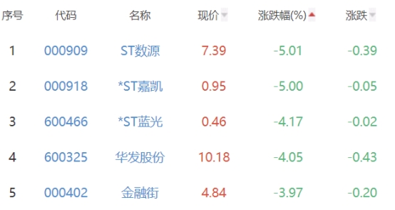 ST数源、*ST嘉凯、*ST蓝光、华发股份、金融街位列板块涨幅榜后五位,涨幅分别为-5.01%、-5.00%、-4.17%、-4.05%和-3.97%。