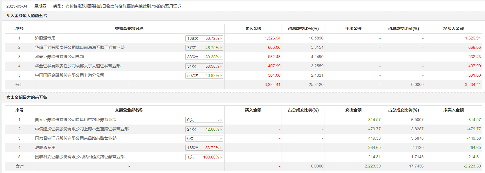 具体来看,沪股通专用、华鑫证券佛山南海海五路证券营业部分别买入1326.94万元、666.06万元;国元证券青岛山东路证券营业部、中信建投证券上海市五莲路证券营业部分别卖出814.57万元、479.77万元。