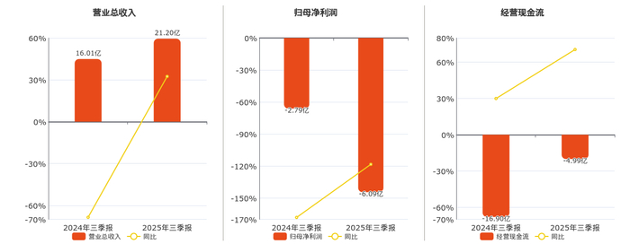 公司营业总收入为21.20亿元,较去年同报告期营业总收入增加5.19亿元,同比较去年同期上涨32.45%。归母净利润为-6.09亿元,较去年同报告期归母净利润减少3.30亿元。经营活动现金净流入为-4.99亿元,较去年同报告期经营活动现金净流入增加11.91亿元,实现2年连续上涨。