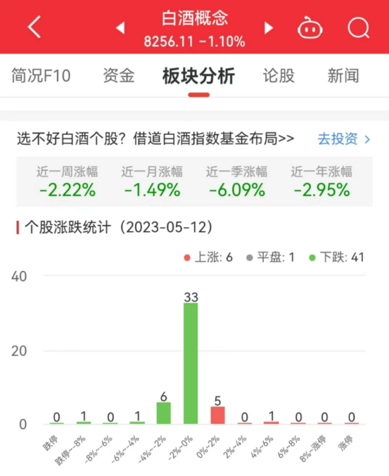数据显示,截至今日,白酒概念板块近一周涨幅-2.22%,近一月涨幅-1.49%,近一季涨幅-6.09%。