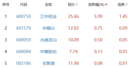 其中,江中药业、会稽山、古越龙山、中葡股份、全聚德位列板块涨幅前五位,涨幅分别为5.99%、0.75%、0.50%、0.13%、0.08%。