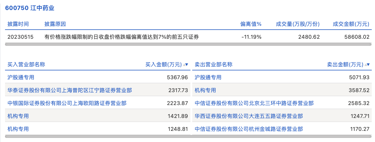 5月15日,江中药业今日跌停,龙虎榜数据显示,上榜营业部席位全天成交2.62亿元,占当日总成交金额比例为44.78%。其中,买入金额为1.26亿元,卖出金额为1.37亿元,合计净卖出1082.49万元。