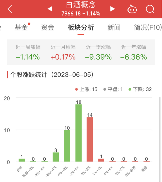 中国经济网北京6月5日讯今日,白酒概念板块整体跌幅1.14%,其中15只股票上涨,1只股票平盘,32只股票下跌。