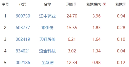 其中,江中药业、来伊份、天虹股份、流金科技、全聚德位列板块涨幅前五位,涨幅分别为3.96%、1.83%、1.64%、1.34%、0.98%。