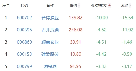 舍得酒业、古井贡酒、顺鑫农业、建发股份、酒鬼酒位列涨幅榜后五位,涨幅分别为-10.00%、-4.62%、-4.51%、-4.42%、-3.33%。