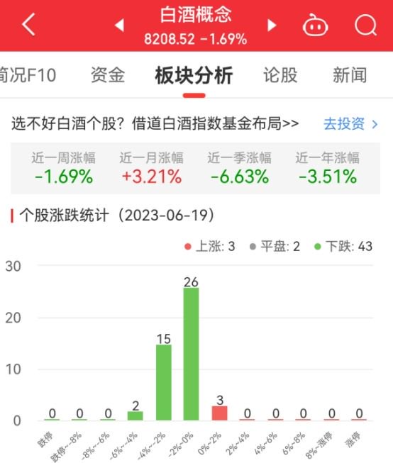 中国经济网北京6月19日讯今日,白酒概念板块整体跌幅1.69%,其中3只股票上涨,2只股票平盘,43只股票下跌。