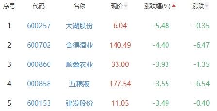 大湖股份、舍得酒业、顺鑫农业、五粮液、建发股份位列涨幅榜后五位,涨幅分别为-5.48%、-4.40%、-3.93%、-3.55%、-3.49%。