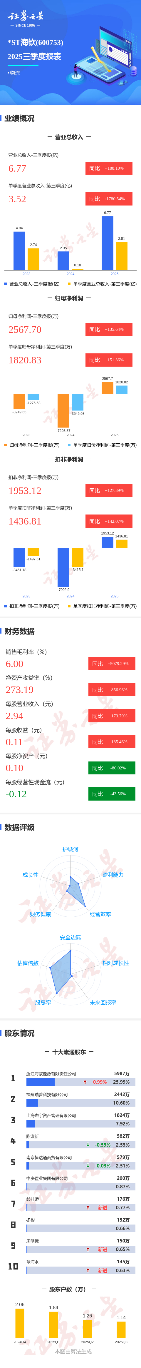 证券之星消息,*ST海钦2025年三季报显示,公司主营收入6.77亿元,同比上升188.11%;归母净利润2567.7万元,同比上升135.64%;扣非净利润1953.12万元,同比上升127.89%;其中2025年第三季度,公司单季度主营收入3.52亿元,同比上升1780.55%;单季度归母净利润1820.83万元,同比上升151.36%;单季度扣非净利润1436.81万元,同比上升142.07%;负债率92.11%,投资收益0.53万元,财务费用207.48万元,毛利率6.0%。