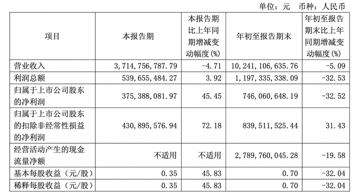 今年前三季度,公司实现营收为102.41亿元,同比减少5.09%;归母净利润为7.46亿元,同比减少32.52%;归属于上市公司股东的扣除非经常性损益的净利润为8.4亿元,同比增长31.43%。