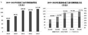 根据中国工程机械工业协会工业车辆分会近五年统计数据显示,2019年,我国工业车辆行业销量为60.83万台(含出口),至2023年已达117.38万台(含出口),期间年复合增长率达17.86%。从产品结构上来看,在“3060”双碳目标背景下,2019-2023年我国工业车辆行业总销量中,电动车销量占比由49.09%增长至67.87%。随着国内经济规模总量的稳定增长,新兴产业的快速发展,国家物流效率的持续提升,龙 头企业全球竞争力的持续增强,以及人力用工成本的不断上涨,未来我国工业车辆行业市场规模仍有着较大的持续发展空间;同时新能源、智能化等新技术、新趋势以及车辆使用寿命的限制也将持续带动工业车辆产品的结构变化和更新换代需求。