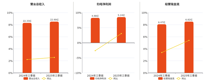 公司营业总收入为22.90亿元。归母净利润为5.14亿元。经营活动现金净流入为6.82亿元。