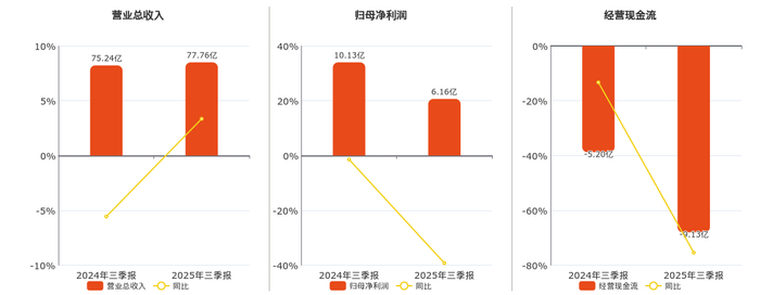 公司营业总收入为77.76亿元,在已披露的同业公司中排名第6,较去年同报告期营业总收入减少5.48亿元,同比较去年同期下降6.59%。归母净利润为6.16亿元,在已披露的同业公司中排名第6,较去年同报告期归母净利润减少4.06亿元,同比较去年同期下降39.72%。经营活动现金净流入为-9.13亿元,在已披露的同业公司中排名第41,较去年同报告期经营活动现金净流入减少3.09亿元。