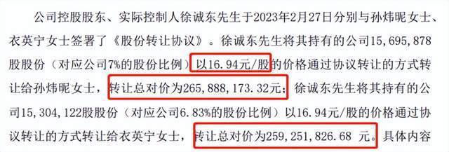 根据此前公告,徐诚东分别与孙炜昵、衣英宁签署了《股份转让协议》。徐诚东以16.94元/股的价格,分别转让给孙炜昵1569.5878万股股份,衣英宁1530.4122万股股份,转让总对价分别是2.66亿元和2.59亿元。