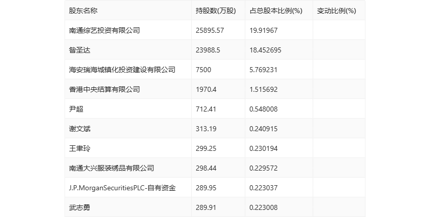半年报显示,2024年上半年末公司十大流通股东中,新进股东为南通大兴服装绣品有限公司、J.P.MorganSecuritiesPLC-自有资金、武志勇,取代了一季度末的大成中证360互联网+大数据100指数型证券投资基金、蔡晓东、南方中证1000交易型开放式指数证券投资基金。在具体持股比例上,香港中央结算有限公司持股有所上升。
