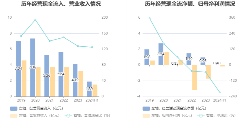 2024年上半年,公司营业收入现金比为125.07%,净现比为-208.60%。